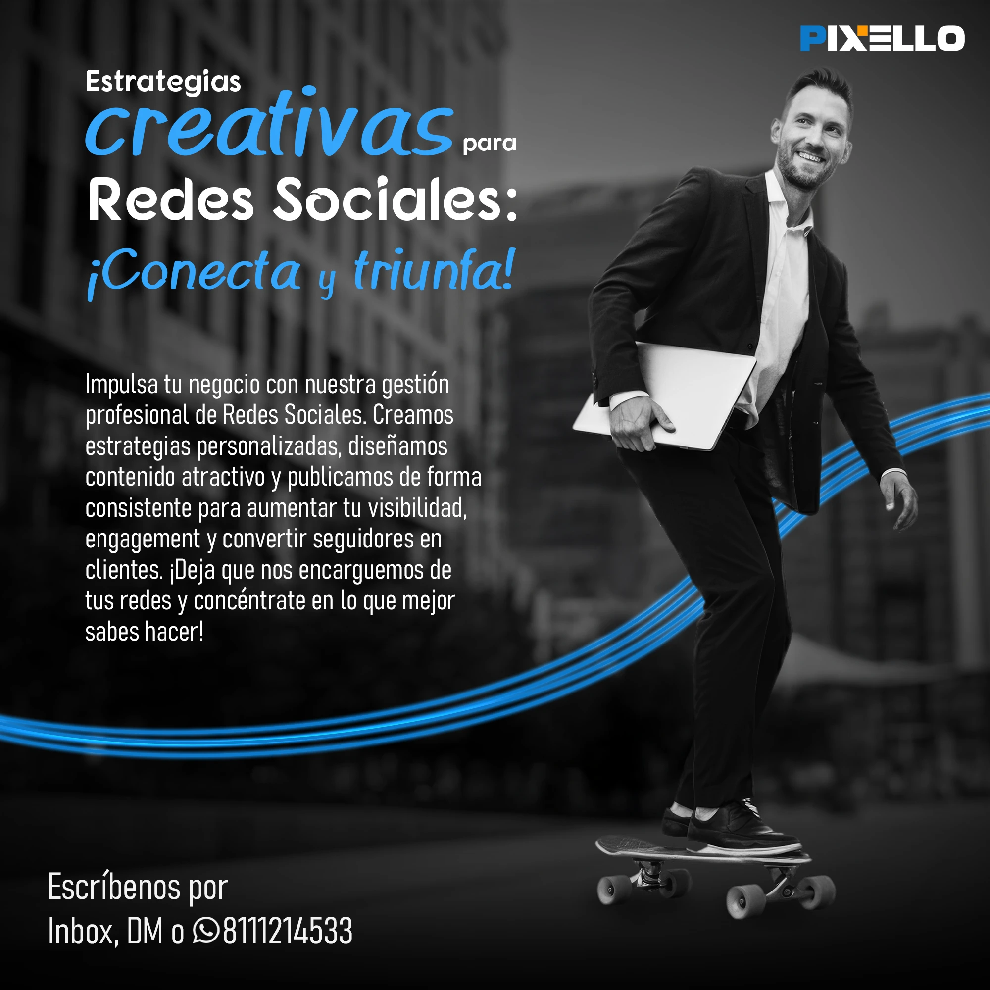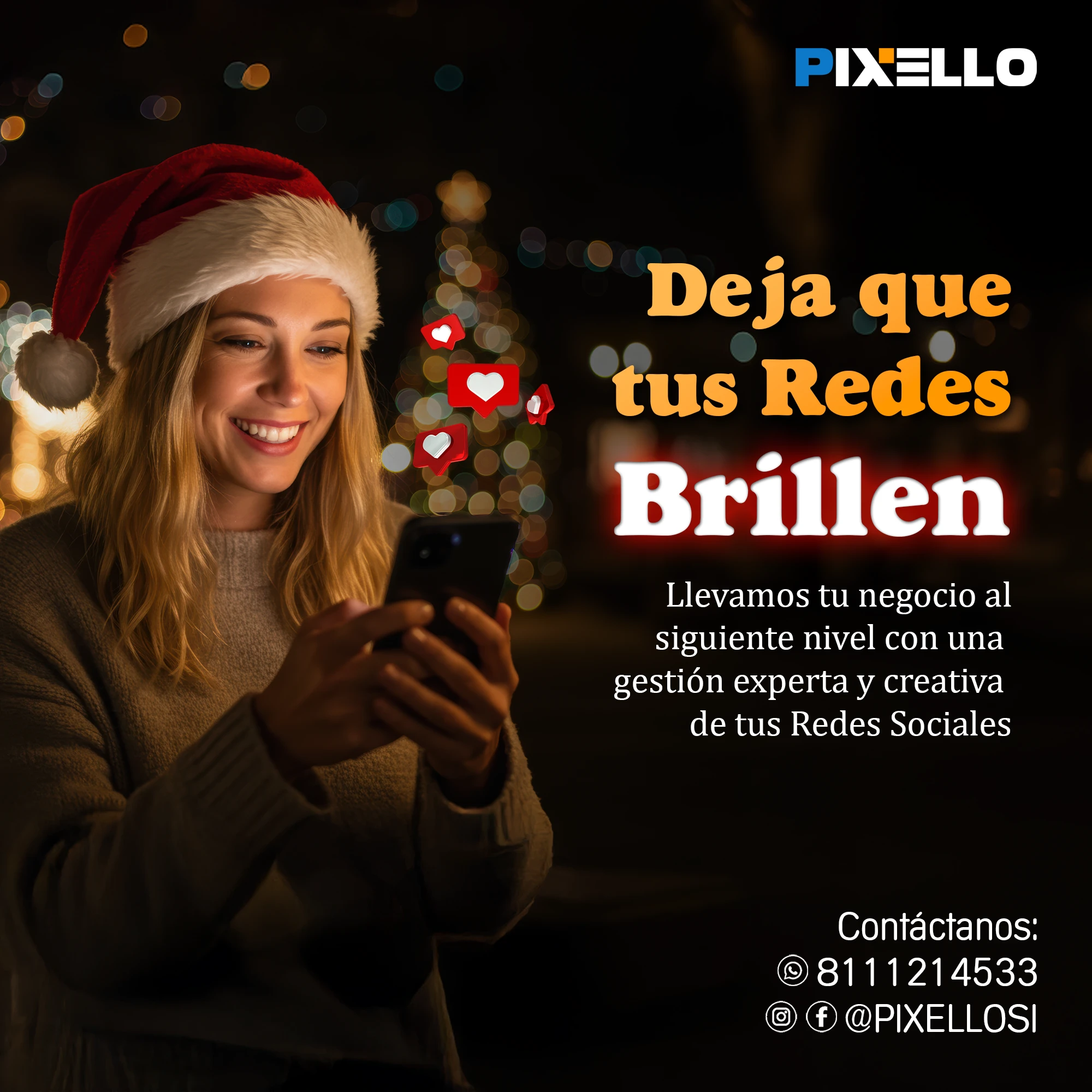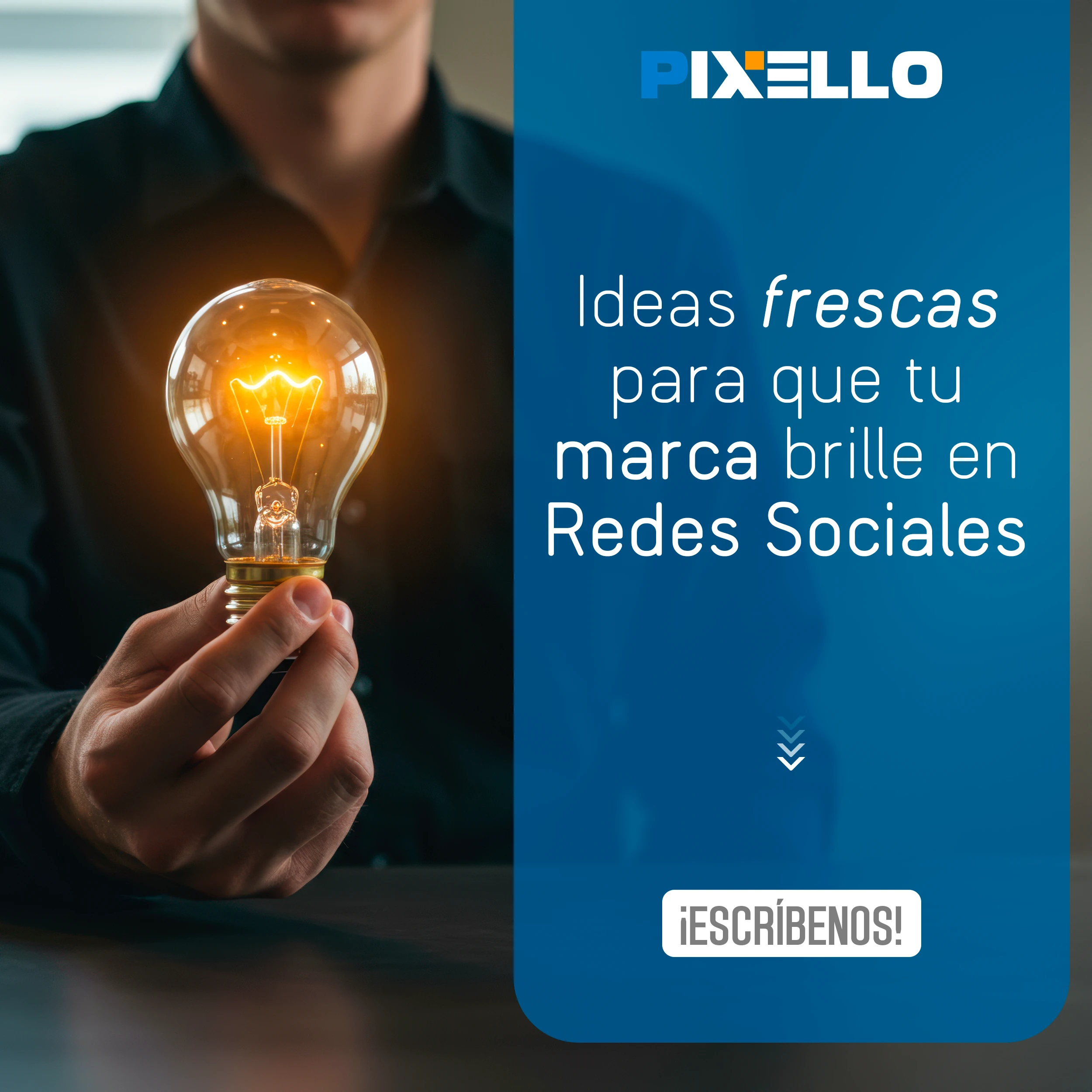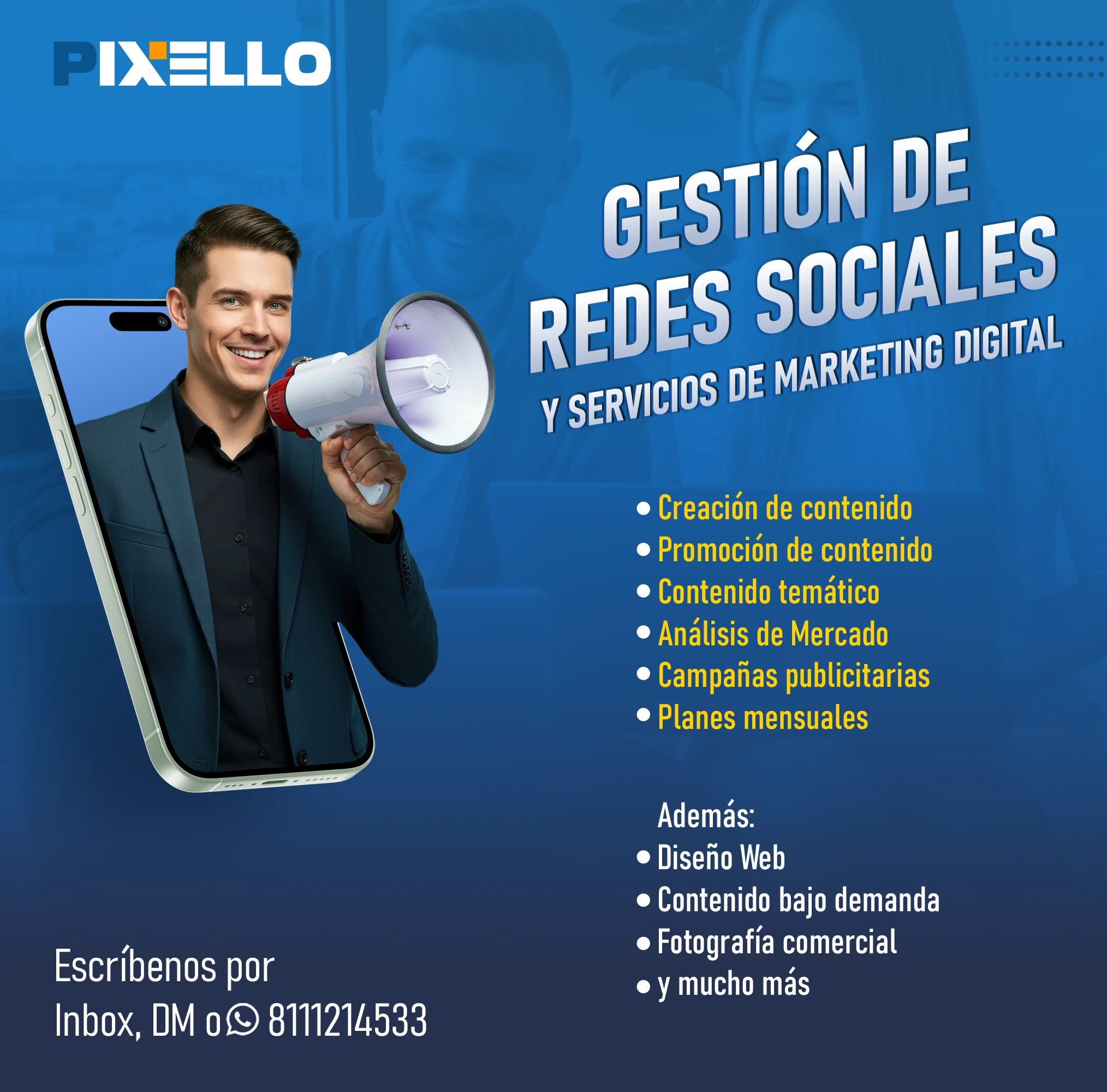 ¿Quieres hacer crecer tu negocio con el poder de la imagen y la comunicación? Entonces, Pixello es tu mejor opción. En Pixello, somos expertos en crear soluciones visuales y digitales para todo tipo de proyectos. Ya sea que necesites gestionar tus redes sociales, diseñar tu página web, producir fotografía y video comercial, o generar contenido de calidad, nosotros tenemos lo que buscas. En Pixello, nos adaptamos a tus necesidades y te ofrecemos un servicio personalizado, profesional y eficiente. No importa cuál sea tu objetivo, nosotros te ayudamos a lograrlo.