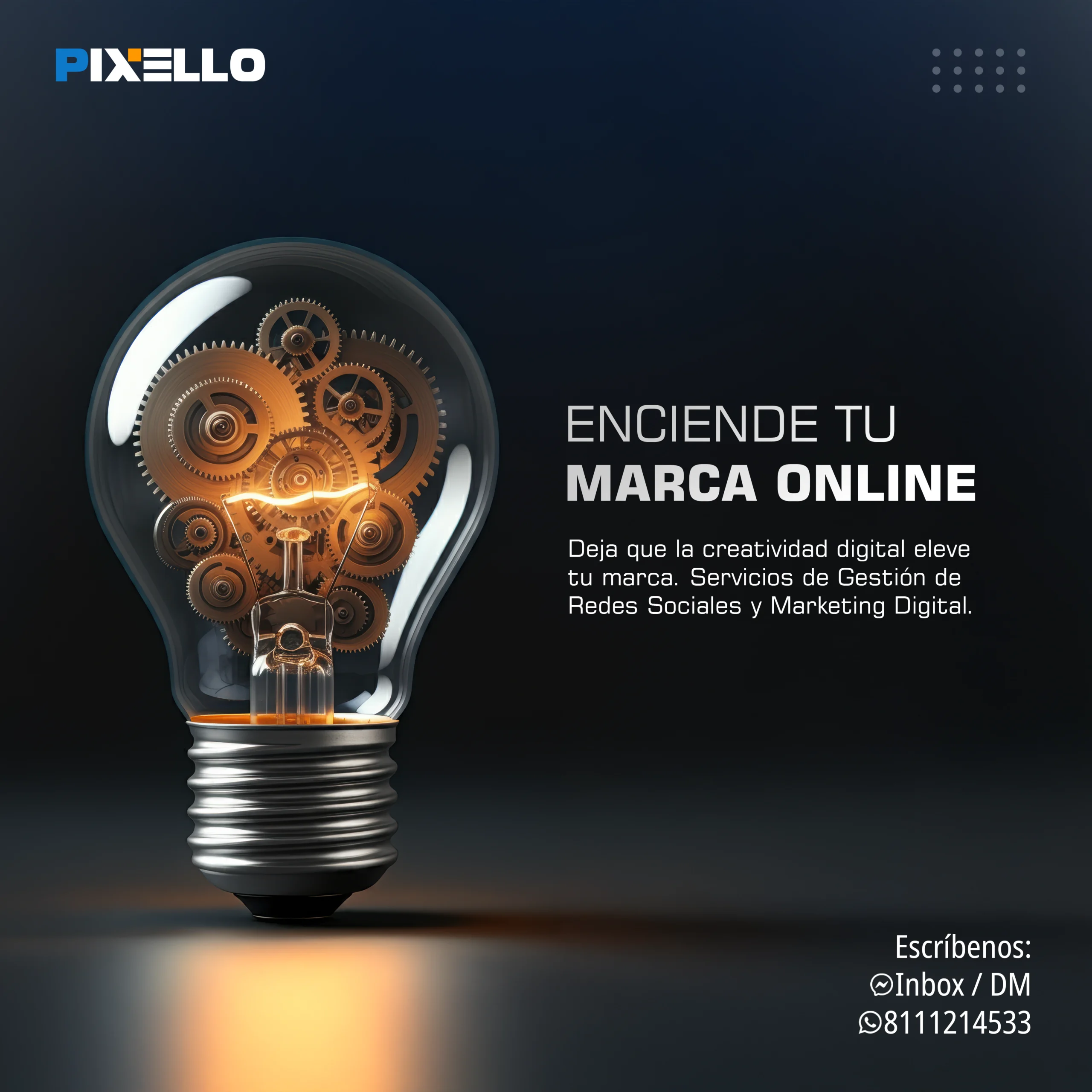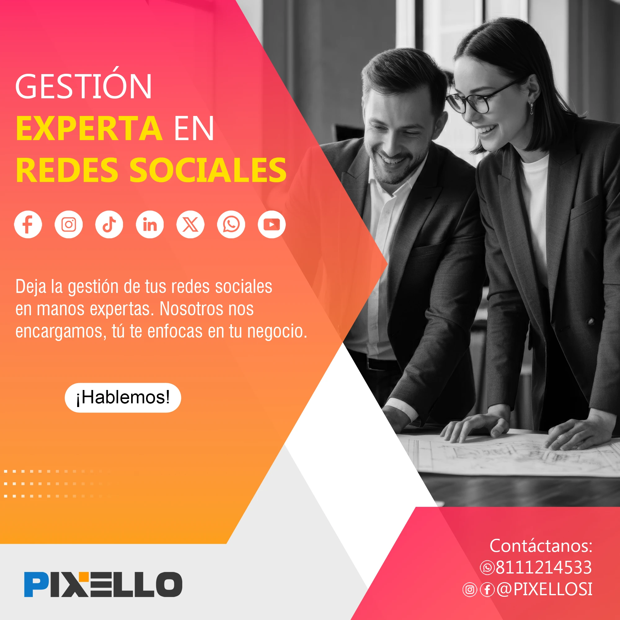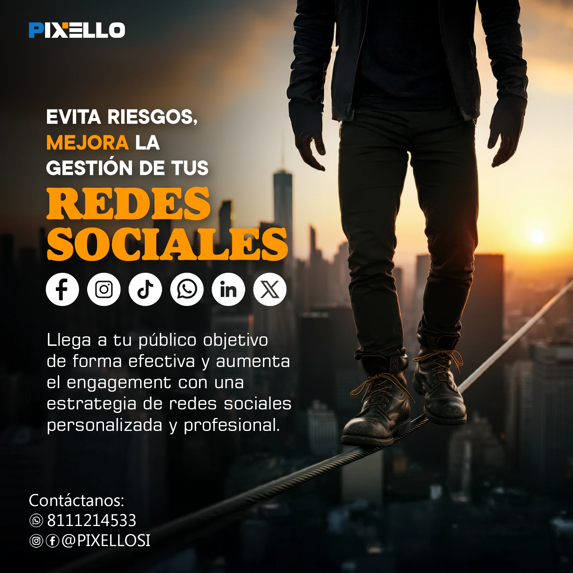 ¿Quieres hacer crecer tu negocio con el poder de la imagen y la comunicación? Entonces, Pixello es tu mejor opción. En Pixello, somos expertos en crear soluciones visuales y digitales para todo tipo de proyectos. Ya sea que necesites gestionar tus redes sociales, diseñar tu página web, producir fotografía y video comercial, o generar contenido de calidad, nosotros tenemos lo que buscas. En Pixello, nos adaptamos a tus necesidades y te ofrecemos un servicio personalizado, profesional y eficiente. No importa cuál sea tu objetivo, nosotros te ayudamos a lograrlo.