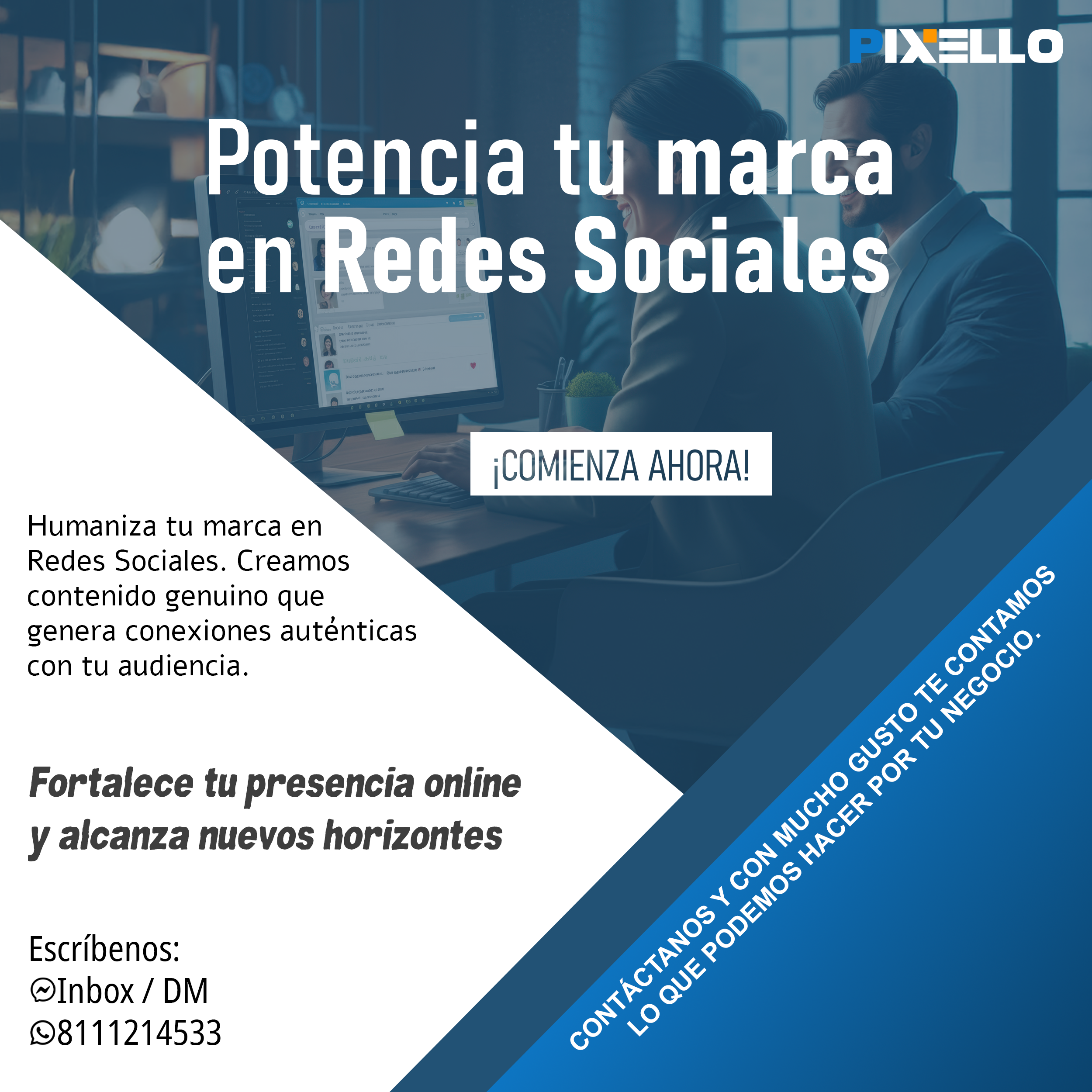 ¿Por qué contratarnos? Nos dedicamos a ofrecer soluciones creativas y efectivas para potenciar tu marca o negocio en el mundo digital. Contamos con una amplia experiencia y conocimientos en el campo del marketing, la comunicación y el diseño. Nos adaptamos a tus necesidades y objetivos, y te ofrecemos un servicio personalizado y de calidad. Trabajamos con pasión, profesionalismo y compromiso, y buscamos siempre superar tus expectativas. Queremos ser tu aliado estratégico y ayudarte a alcanzar el éxito que mereces.